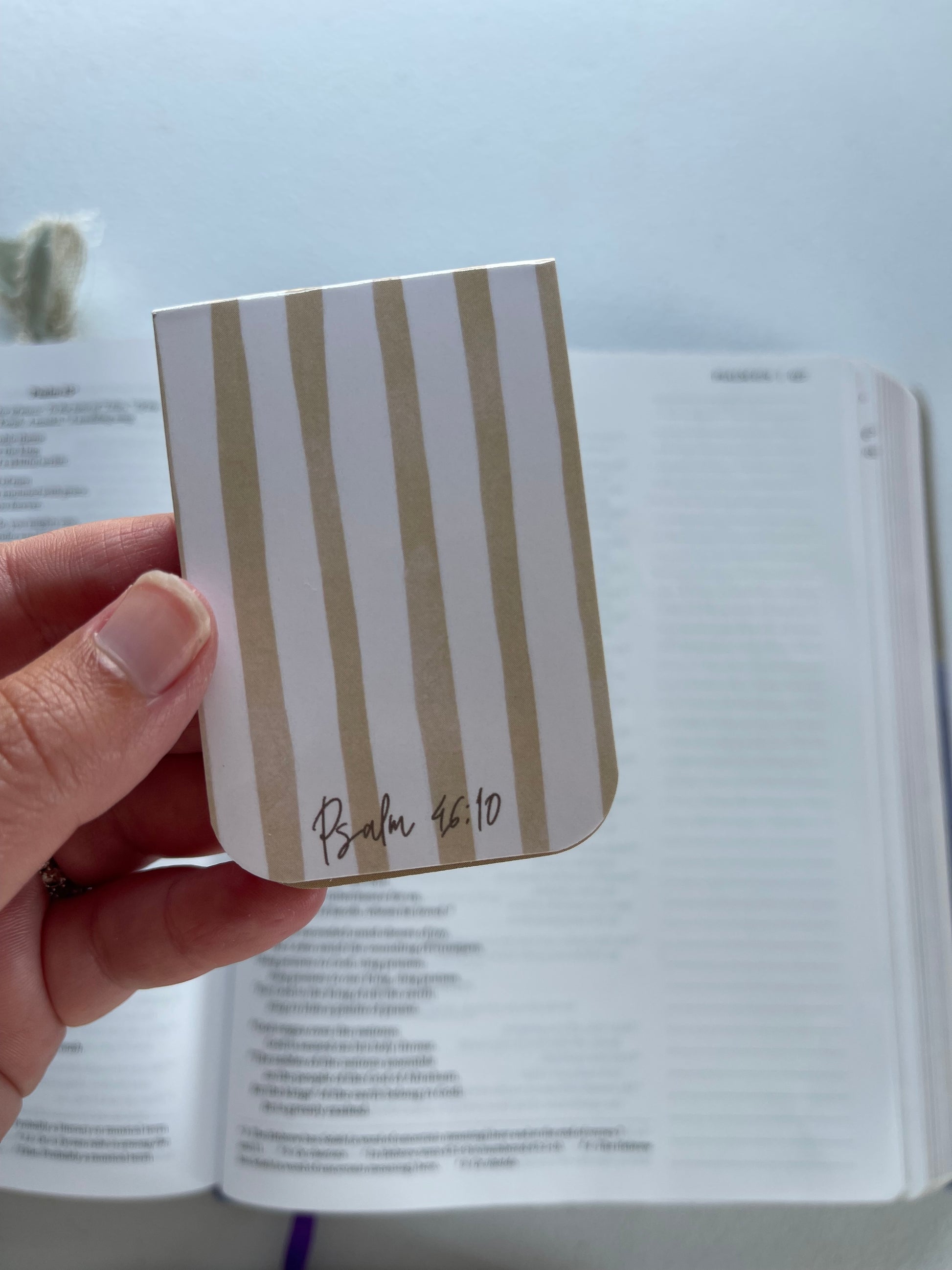 Front of Bookmark - “be still and know I am God” on tan striped background