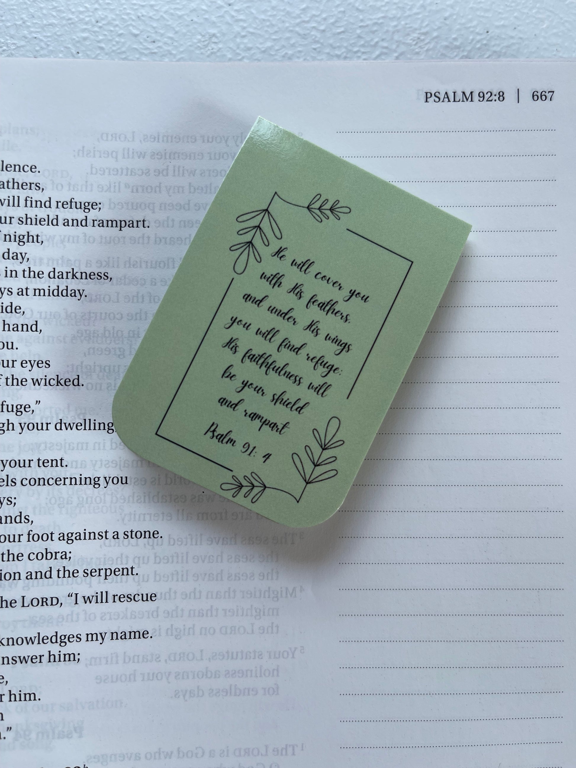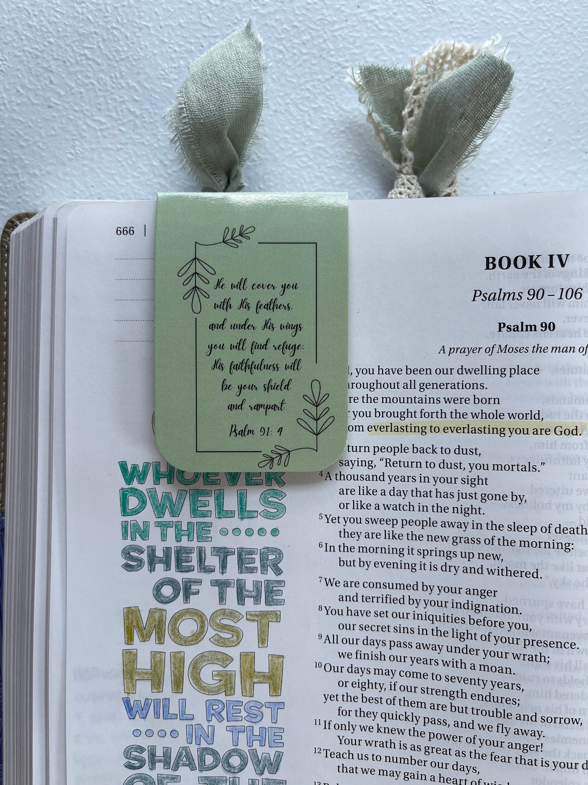 Front of Bookmark - “He will cover you with His feathers and under His wings you will find refuge: His faithfulness will be your shield and rampart Psalm 91:4”