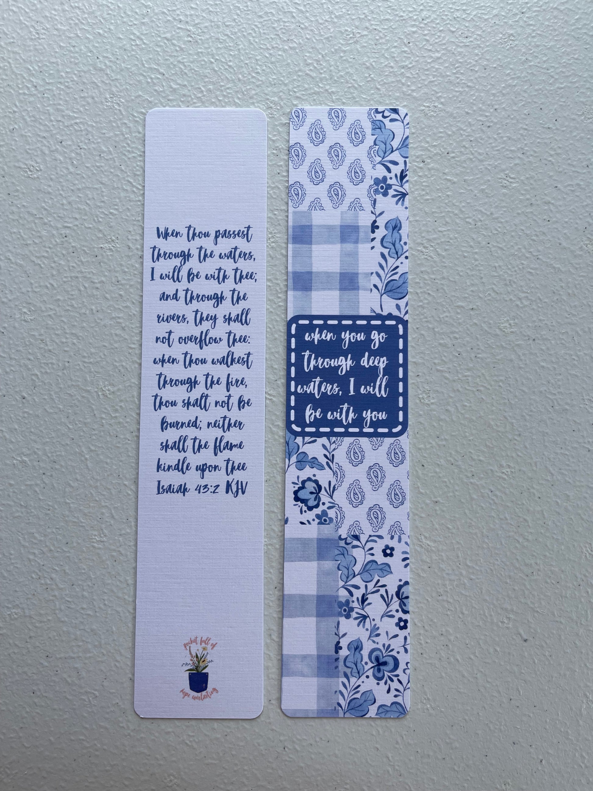 Front of Bookmark - “When you go through deep waters, I will be with you” on blue patchwork design
