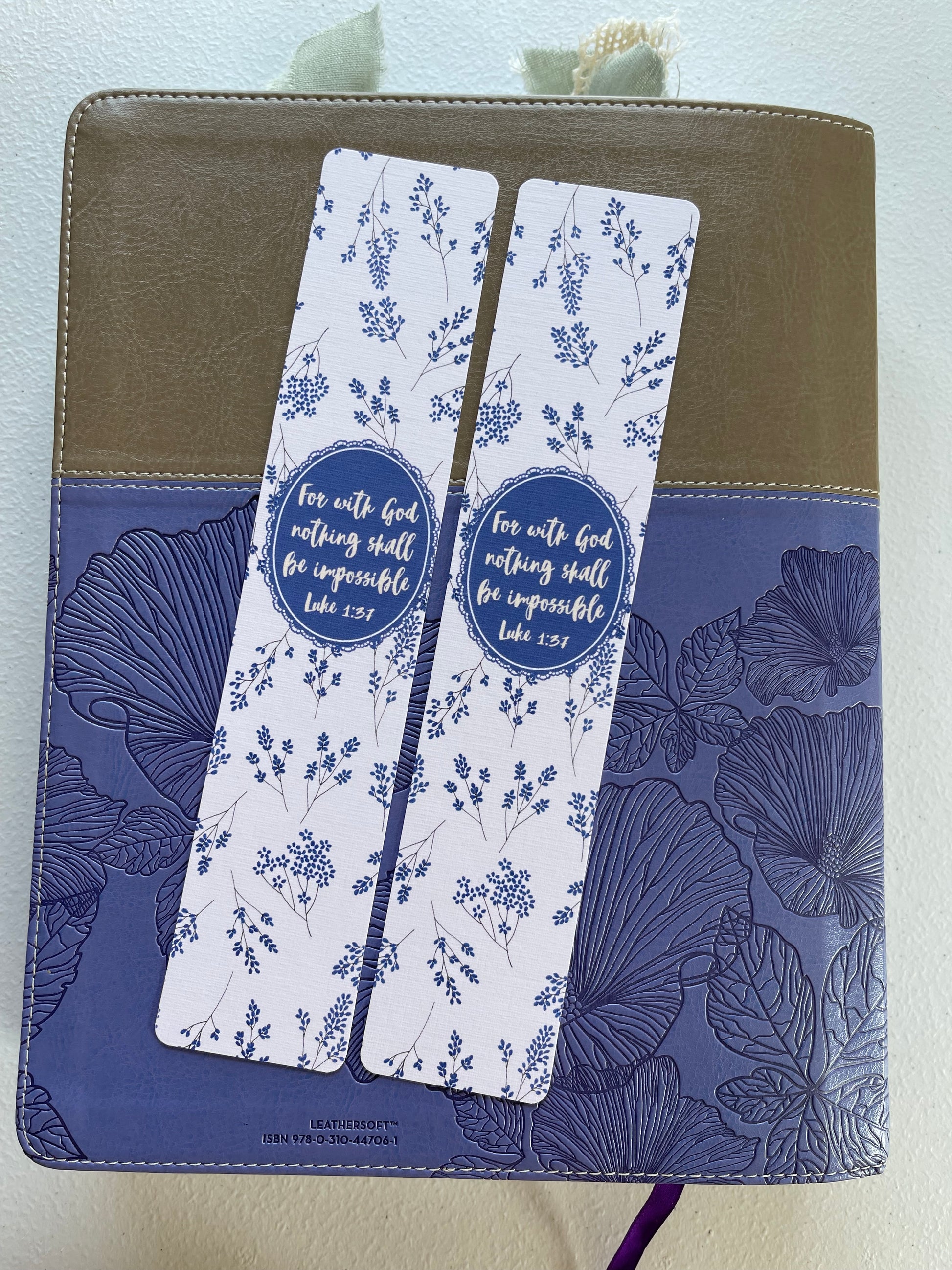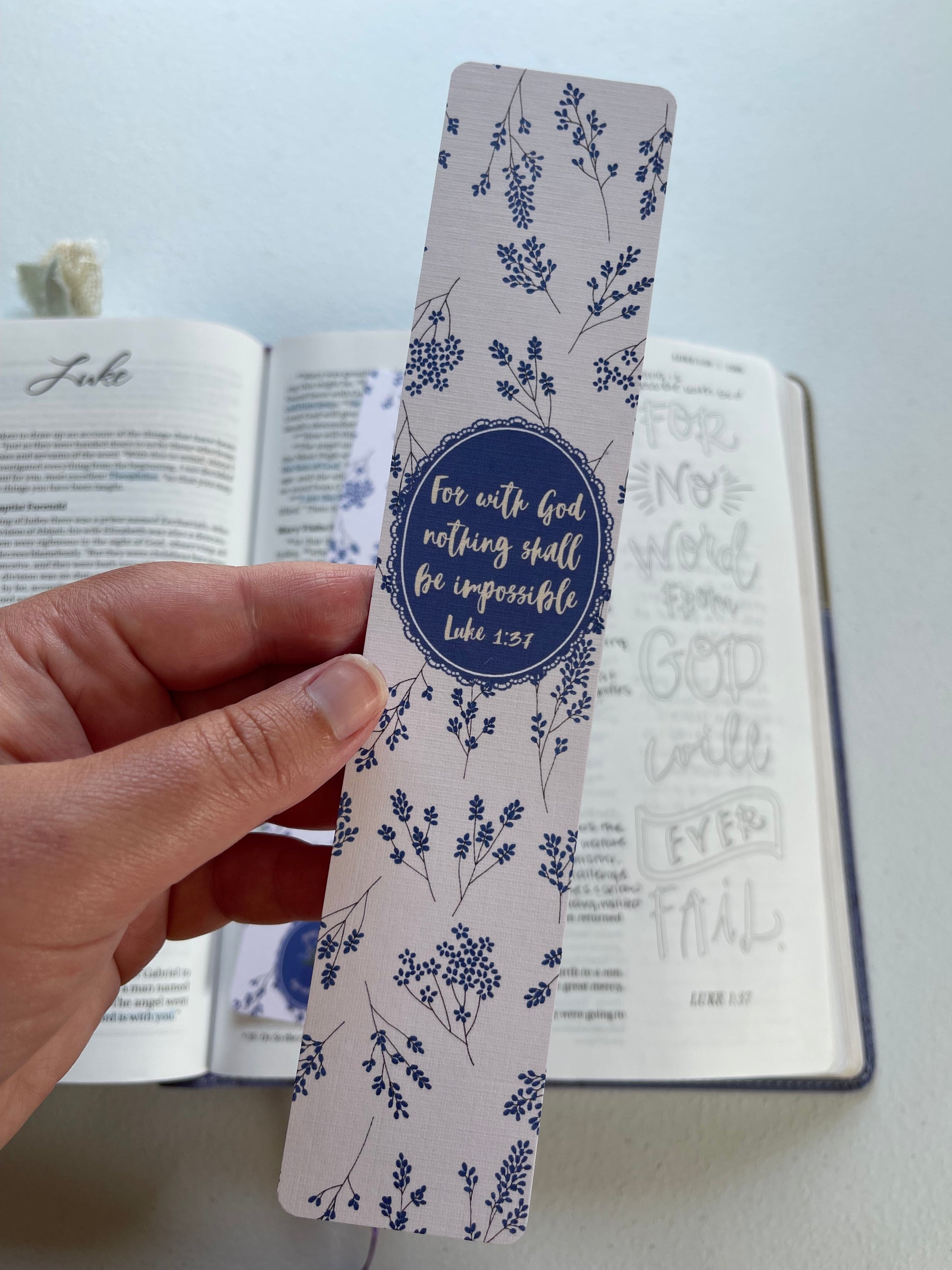 Front of Bookmark - “For with God nothing shall be impossible Luke 1:37” on deep blue and cream floral background.