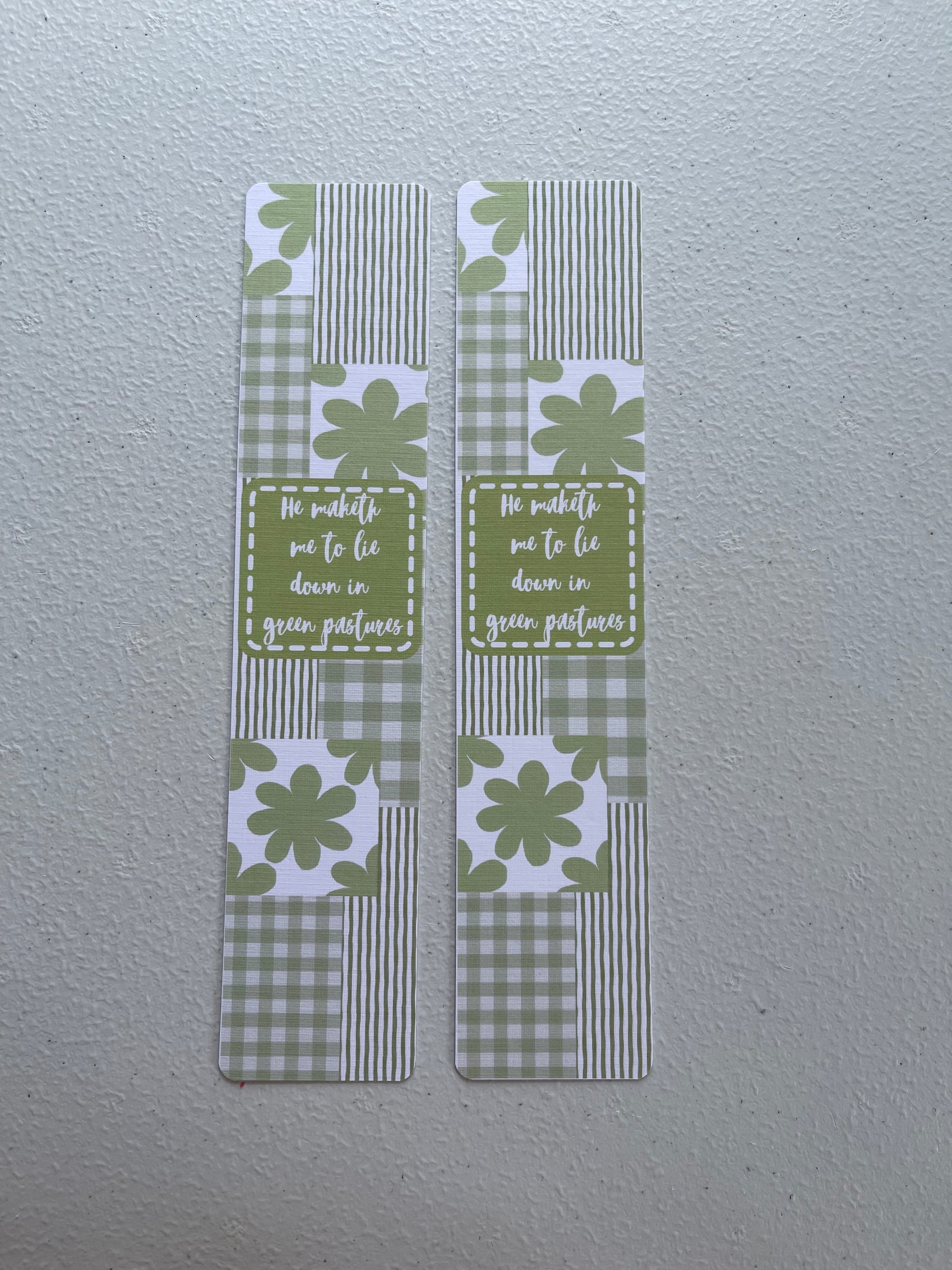 Front of Bookmark - “He maketh me to lie down in green pastures” on green patchwork design