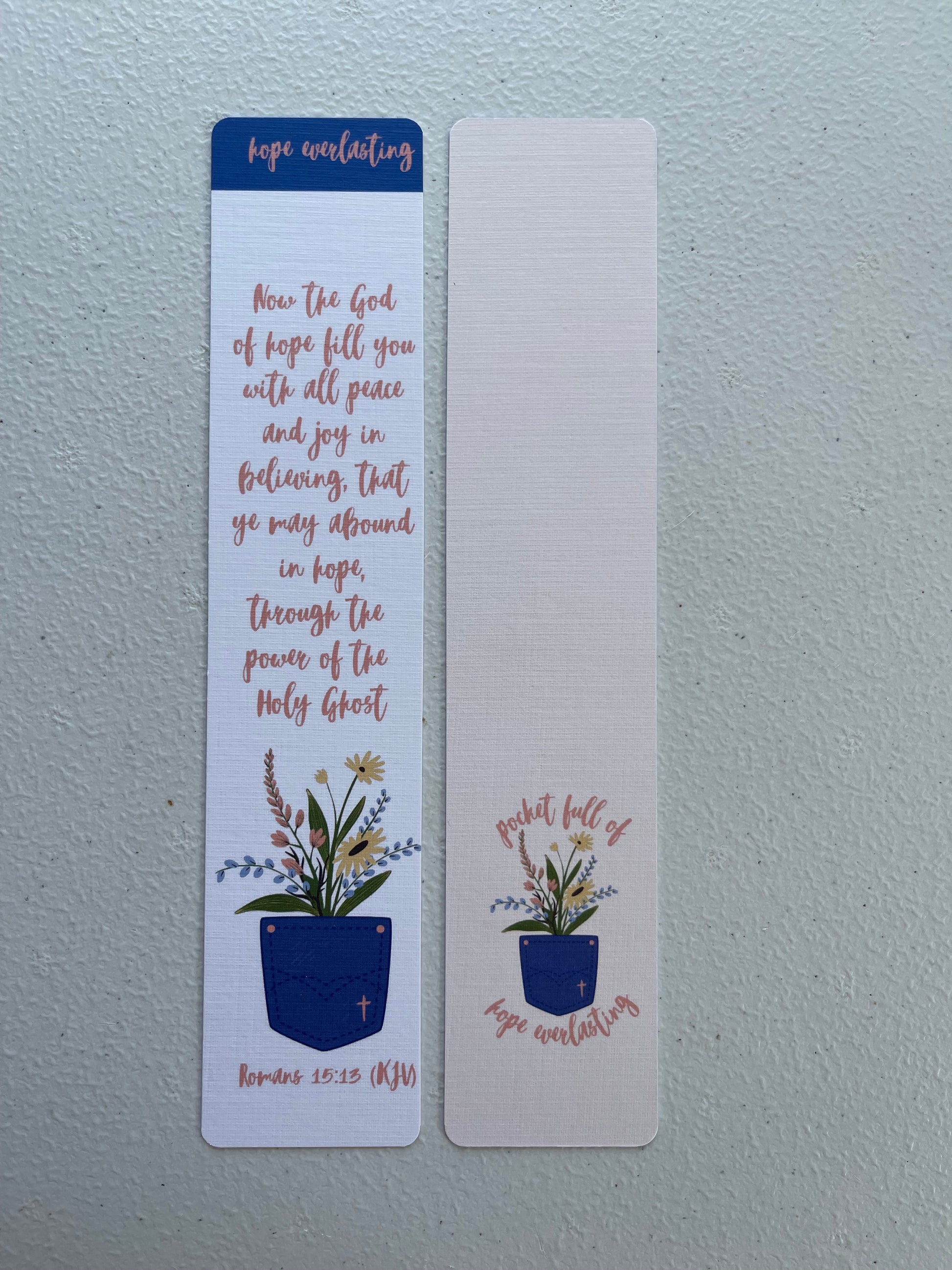 Front of Bookmark - “Now the God of hope fill you with all peace and joy in believing, that ye may abound through the power of the Holy Ghost” Romans 15:13 (KJV)