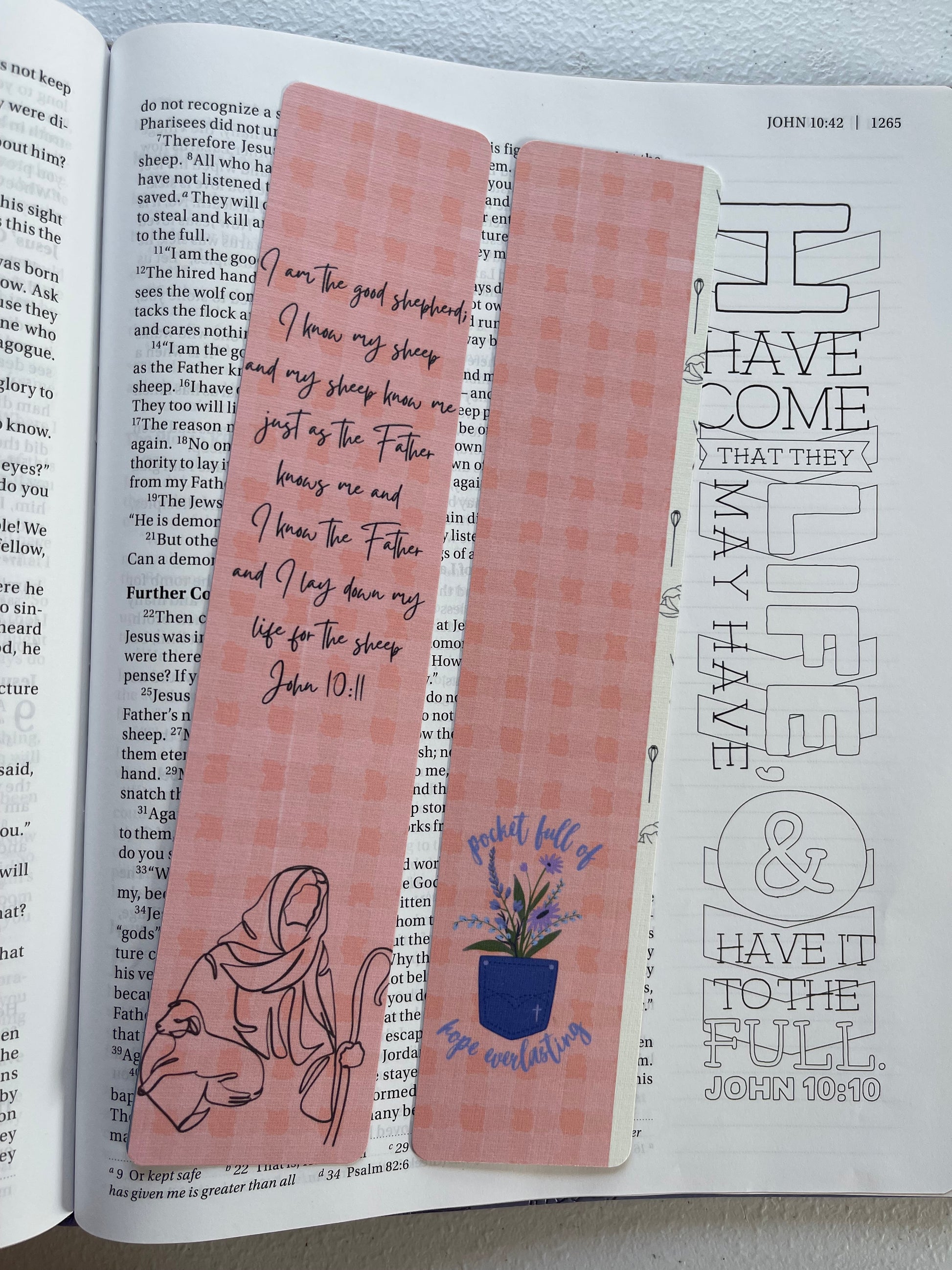 Front of Bookmark - “I am the good shepherd: I know my sheep and my sheep know me just as the Father knows me and I know the Father and Iay down my life for the sheep John 10:11” on coral pattern with outline of Jesus as Shepherd