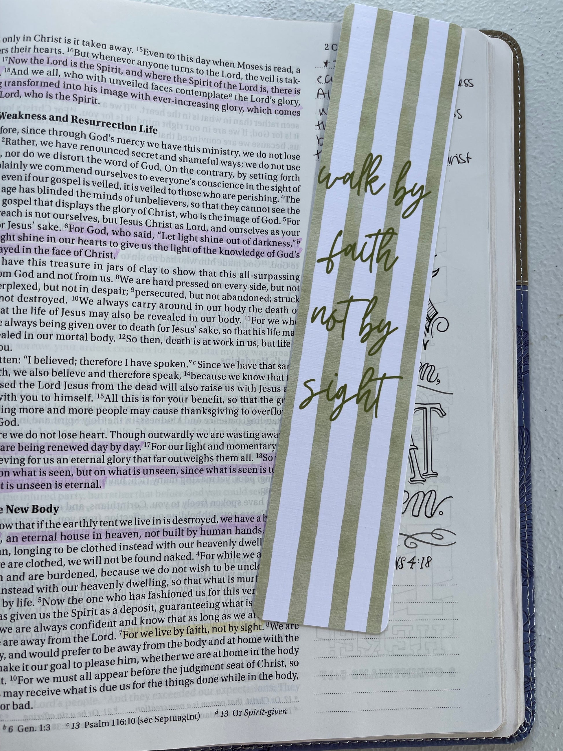 Front of Bookmark - Walk By Faith not by sight on green and white striped pattern